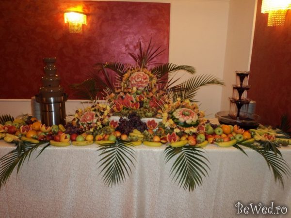 Fantana de ciocolata este o surpriza dulce pentru suprinderea invitatilor dvs. si aduce un plus de rafinament evenimentului, fie ca este folosita la un botez, o nunta eleganta in aer liber, o petrecere corporate sau o petrecere restransa in familie. De asemenea, puteti opta pentru un aranjament spectaculos ce cuprinde fructe sculptate, sculpturi in fructe, pepeni sculptati, aranjamente din fructe in diferite forme, completate de aranjamente florale.