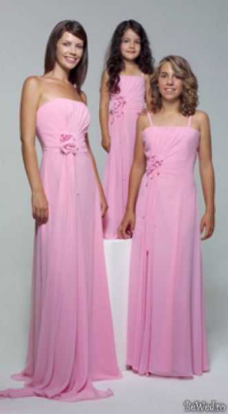 Nu e nimic mai dulce decat iubirea si nicio culoare nu exprima placerea gustului cum o face rozul. Daca vrei sa fii bomboana de pe tort, atunci alege o tinuta de acest gen. Usoara, vaporoasa si foarte eleganta. Indiferent de varsta ti se va potrivi, iar daca esti tu mireasa ai putea sa imbraci domnisoara de onoare in acest gen. Se potriveste cu orice fel de coafura, dar tine cont de varsta! Poate ca fetita de 12 ani pe care o vrei domnisoara de onoare nu e de acord cu un coc scortos.